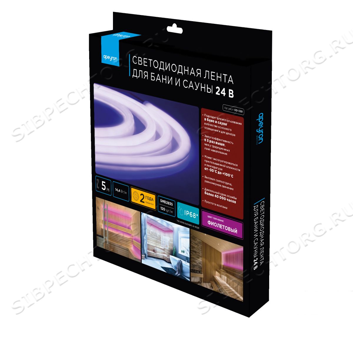 Светодиодная лента для бани и сауны с артикулом 00-329 работает от постоянного тока с напряжением 24В. Благодаря светодиодам smd 2835 излучающим световой поток равный 900 Лм/м* лента используется для вспомогательной декоративной подсветки областей интерьерного пространства. Светодиодная лента эквивалентна лампам накаливания мощностью 90 Вт. Данная модель светодиодной ленты обладает фиолетовым цветом свечения. При выборе светодиодной ленты важно учитывать такой параметр, как потребляемая мощность, чтобы правильно подобрать блок питания. У данной модели этот показатель равен 14,4 Вт на один метр. Степень защиты этого изделия соответствует стандарту IP68. Она предназначена для установки в помещениях с повышенной концентрацией влажности и повышенной температурой. Герметичная силиконовая оболочка позволяет использовать светодиодную ленту в банях и саунах. Не использовать в воде! Отрезать светодиодную ленту можно в специально отмеченных местах, которые располагаются через каждые 50 мм.