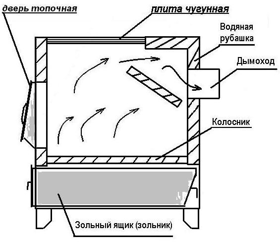 Котел – 1 шт., дверь топочная – 1 шт., зольник металлический – 1 шт. колосник – 1 шт. ,