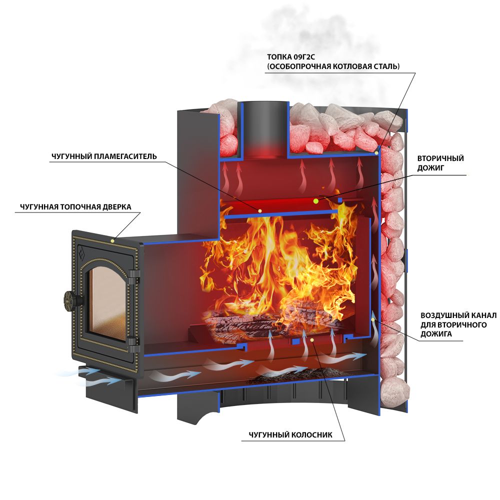 Воздух в зону горения подаётся через поддувало, его количество регулируется зольным ящиком совкового типа. Открытый зольник усиливает горение, закрытый – замедляет его. Чугунный пламегаситель перенаправляет поток горячего воздуха и дымовых газов к задней части топки. Это позволяет снять с печи максимум энергии в единицу времени. Чугунная дверь при нагревании не деформируется, сохраняет свою форму при остывании и предотвращает попадание продуктов горения на пол перед топкой. Печи Везувий СКИФ оснащаются сетками для камней. Сетки могут быть сделаны из металлического прутка или кованой стальной ленты шириной 40 мм. В сетки по всей высоте укладываются камни для бани, обеспечивая большой объём заклада и длительное удержание тепла после прогрева каменки.